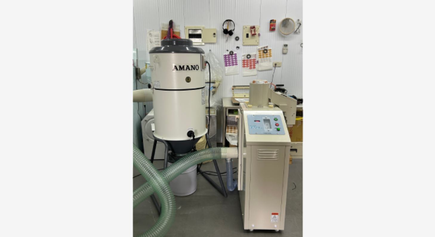 日製集塵器使用,將碾好的白米投入無洗米處理機,