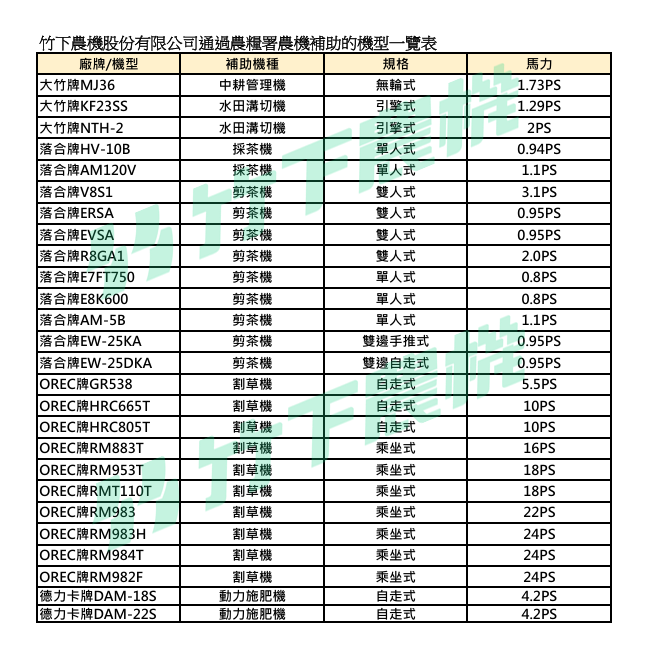 竹下農機通過農糧署農機補助機型一覽表