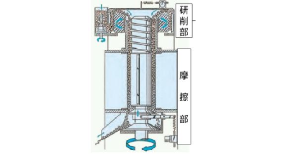 糙米由下往上昇起至研削部,經過甜甜圈狀的石磨,均勻削除每一米粒的表面,送入摩擦部。