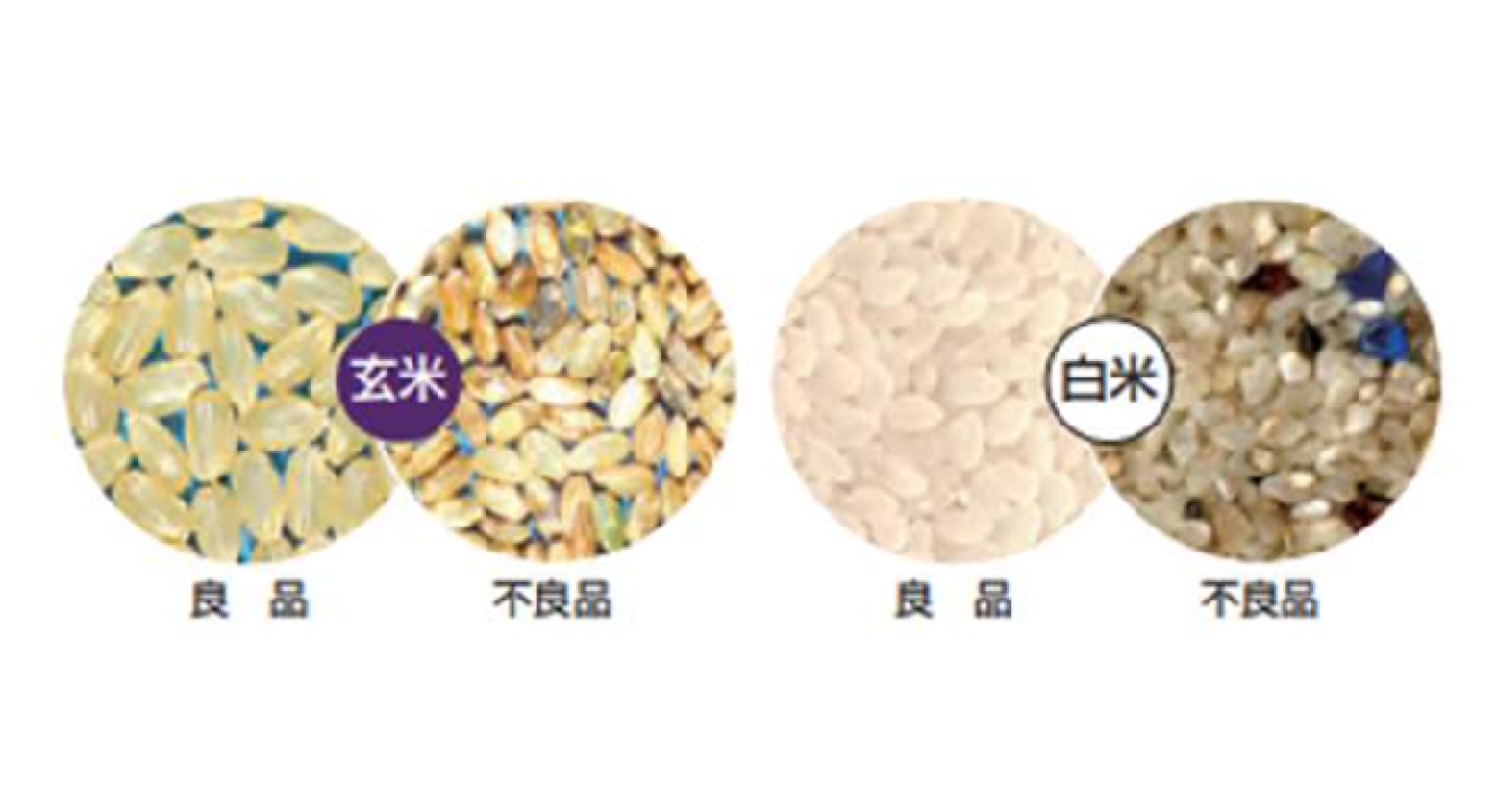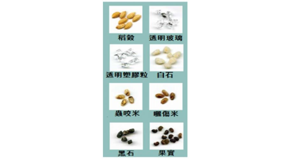 稻穀、透明玻璃、塑膠粒、白石、蟲咬米、曬傷米、黑石頭、果實等。