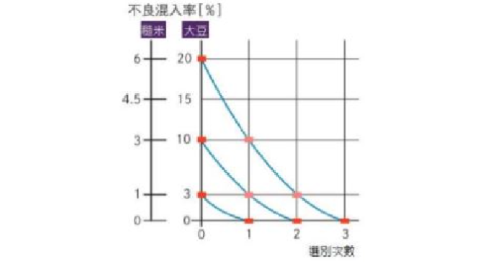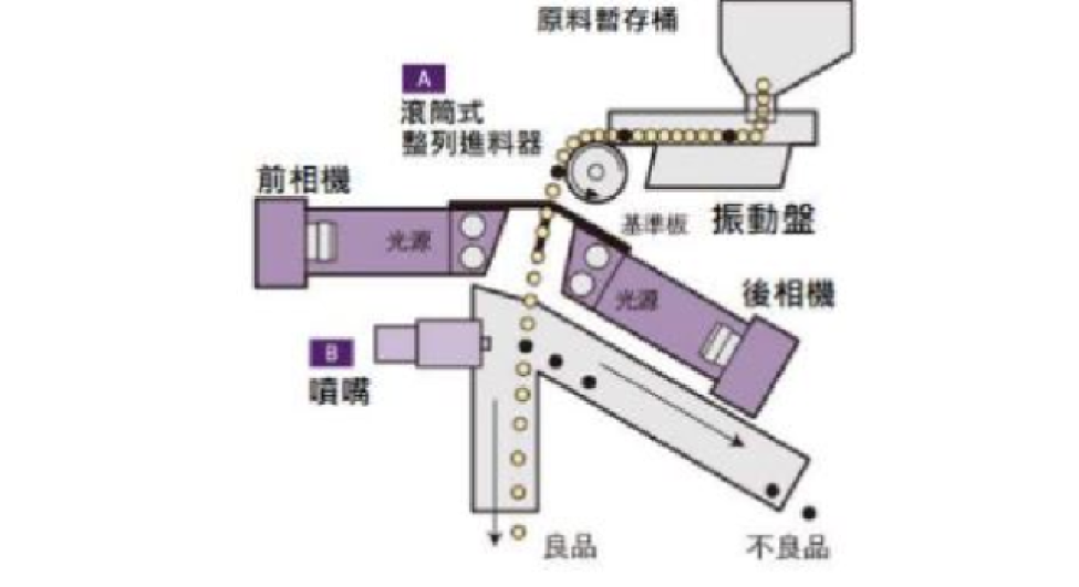 用2台高精密度線掃描相機偵測影像,用噴嘴吹氣將不良品去除。原料中不良品混入率越低,選別次數越少。